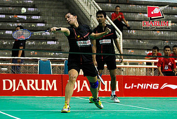 Trikus Haryanto/Nadya Melati (Pertamina Indonesia) menghadang pengembalian dari Darmiko/Deariska Putri (PB Djarum).