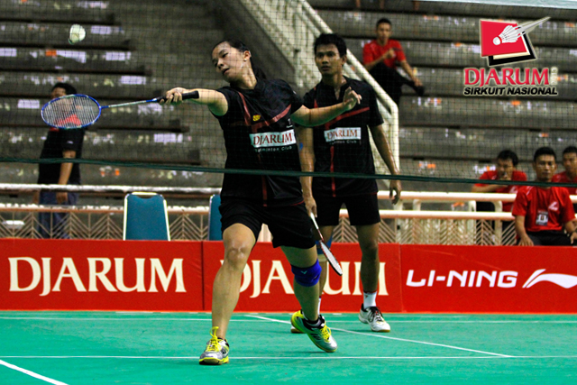 Didit Juang/Nurbeta Kwanrico (PB Djarum) mengembalikan shuttlecock ke arah Ardiansyah Putra/Devi Tika Permatasari (Pertamina Indonesia/SGS PLN).
