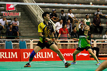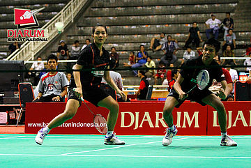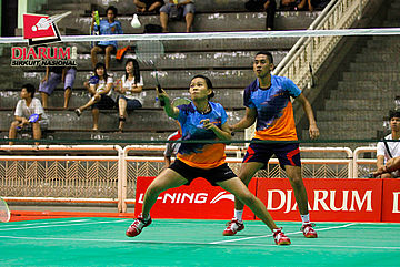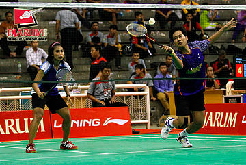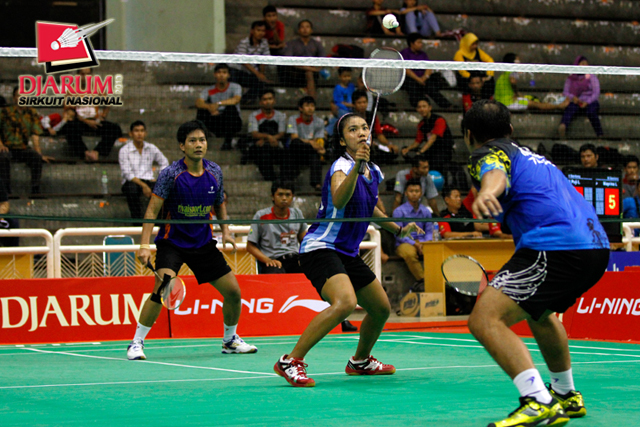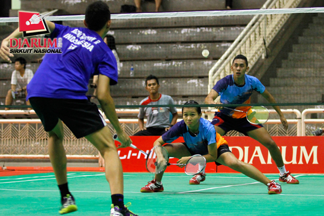Achmad Rivai/Aris Budiharti (Bank Sumsel/Jaya Raya) mengembalikan shuttlecock ke arah Trikus Haryanto/Nadya Melati (Pertamina Indonesia).