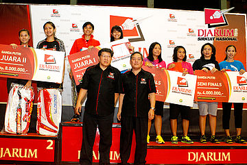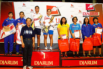 Chintia Rhizta/Ristya Ayu (PB Djarum) mengembalikan shhuttlecock ke arah Jovita Evania/Novalita Anggraeni (Mutiara Bandung).