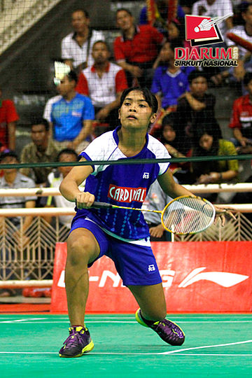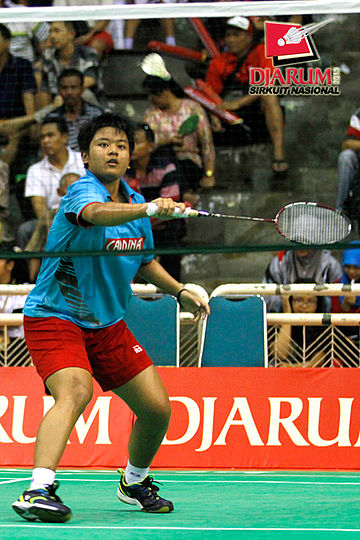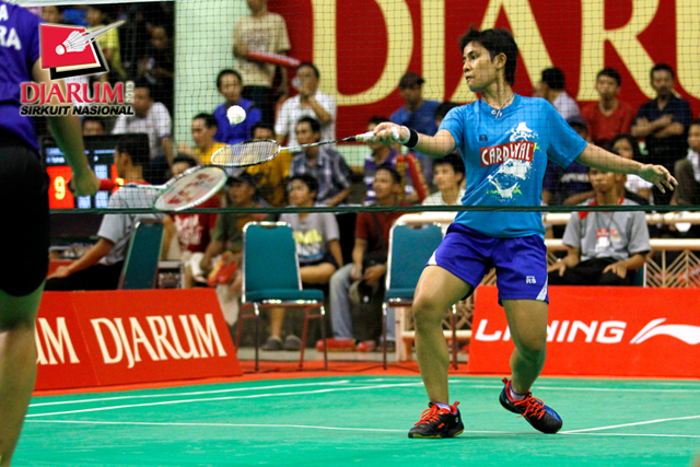 Asty Dwi (Jaya Raya) mengembalikan shuttlecock ke arah Wulan Cahya (PB Djarum).