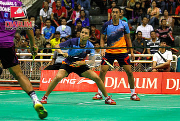 Alamsyah Yunus (Pertamina Indonesia) mengembalikan shuttlecock ke arah Thomi Azizan (Pelatnas).