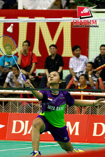 Wulan Cahya (PB Djarum) berhasil menghadang serangan yang dilepaskan Asty Dwi (Jaya Raya).