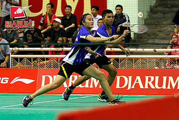 Andika Ramadiansyah/Marsheilla Gischa (PB Djarum) bersiap menyambut pengembalian dari Aji Firmansyah/Bunga Fitriani (Mutiara Bandung).