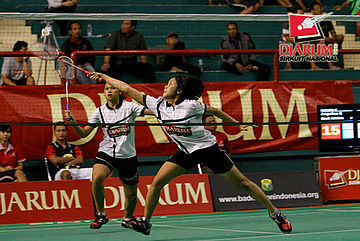 Agdevika Rochmadani S/Rifa Putri A (DJARUM) mencoba menggapai shuttlecock.