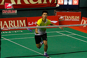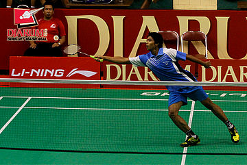 Gayus Elputra (SINGAPURA) mencoba menggapai shuttlecock.