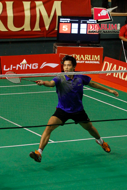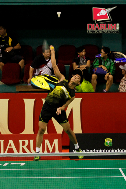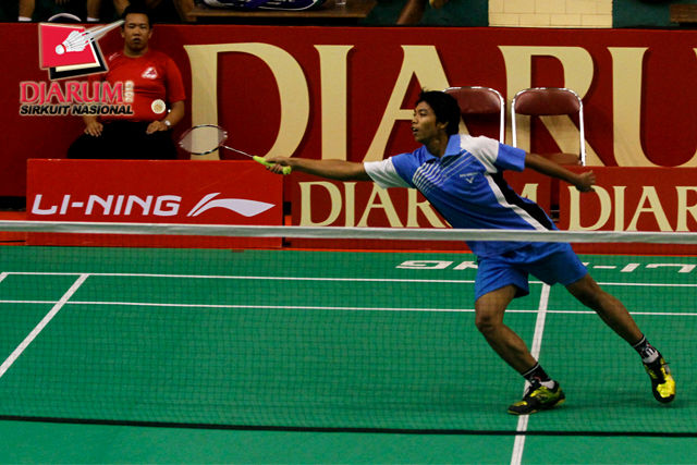 Kaesar Bobby Alexander (ANUGERAH JAKARTA)mengembalikan shuttlecock ke arah Achmad Mahmud Anasafy (PTP MANDIRI).