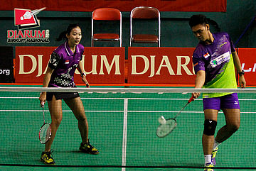 Fajar Alfian/Inten Ratnasari (SGS PLN) berusaha menggapai shuttlecock