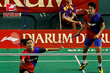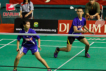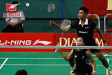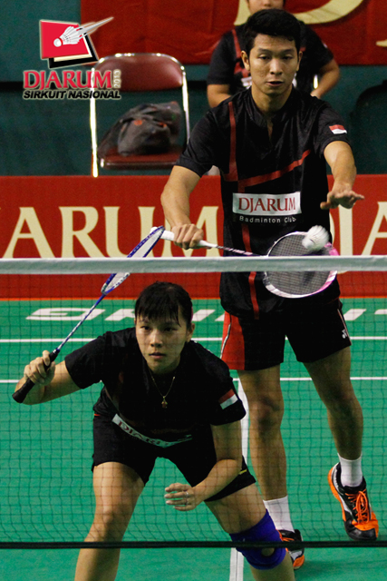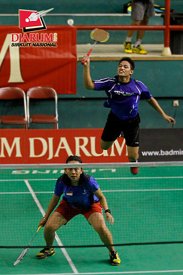 Ardiansyah Putra/Devi Tika P (PERTAMINA/SGS PLN) mencoba menggapai shuttlecock.