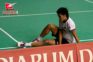 Angger Sudrajad (DJARUM) terjatuh ketika mencoba menggapai shuttlecock.