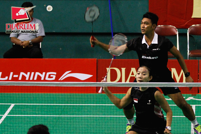 Rahmat Adianto/Nurbeta Kwanrico (DJARUM) serve ke arah Ardiansyah Putra/Devi Tika P (PERTAMINA/SGS PLN).