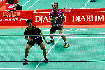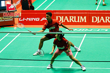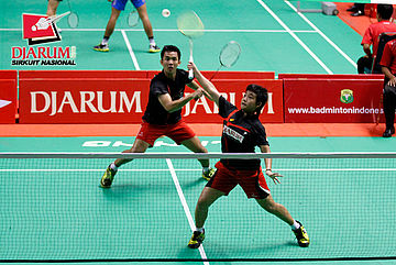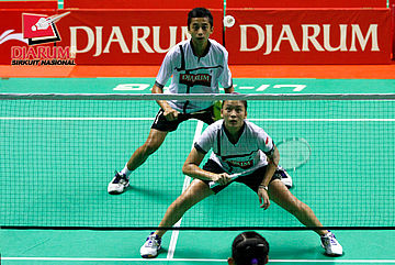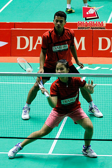 M. Febriansyah/Cynthia Shara (PB Djarum) bersiap menyambut pengembalian dari Aji Firmansyah/Bunga Fitriani (Mutiara Bandung).