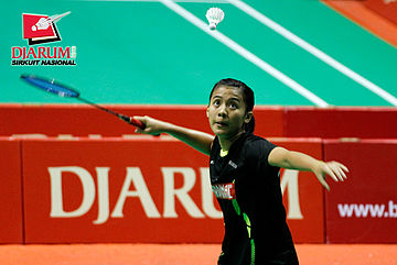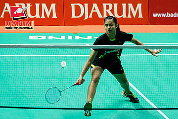 Akbar Gusti/Felicia Parmenas (PB Djarum) menyambar pengembalian tanggung dari Anbiya/Yulfira barkah (Mutiara Bandung).