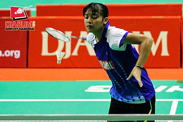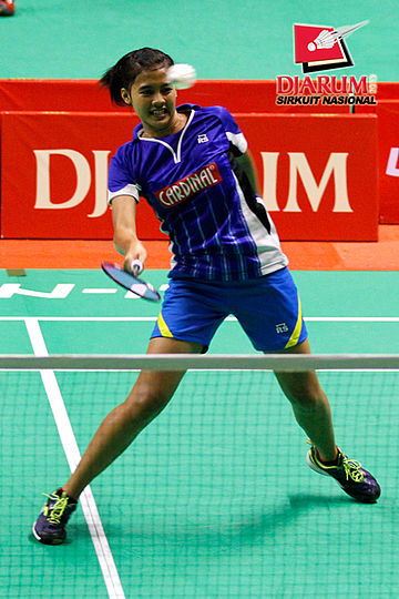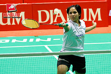 Ganis Nurrahmandani (Pertamina Indonesia) mengembalikan shuttlecock ke arah Elizabeth Purwaningtyas (SGS PLN).