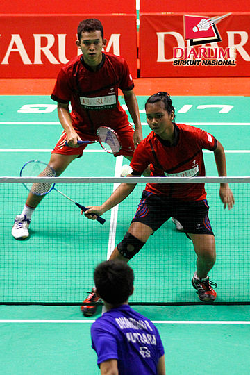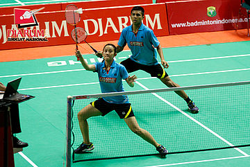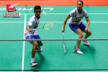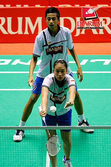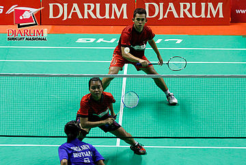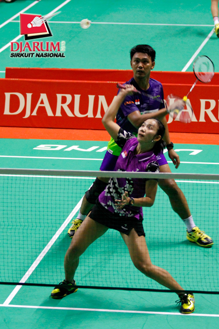 Akbar Gusti/Felicia Parmenas (PB Djarum) bersiap menyambut pengembalian dari Beno Drajat/Rika Rositawati (Mutiara Bandung).