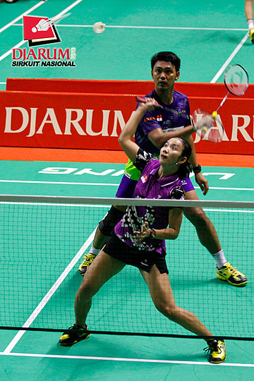 Ardiansyah Putra/Devi Tika Permatasari (Pertamina Indonesia/SGS PLN) bersiap menyambar pengembalian tanggung dari M. Asykuru/Natalia Poluakan (IPC/Tangkas Specs).
