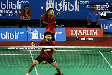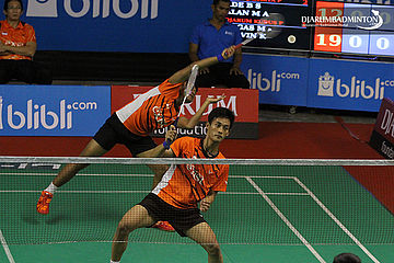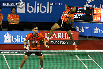 Bagas Maulana/Calvin Ciputra Mengembalikan Shuttlecock