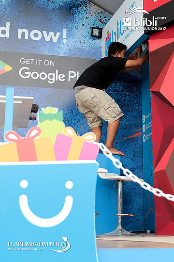 Seorang Pekerja Sedang Mempersiapkan Logistik Blibli.com Superliga Junior 2017