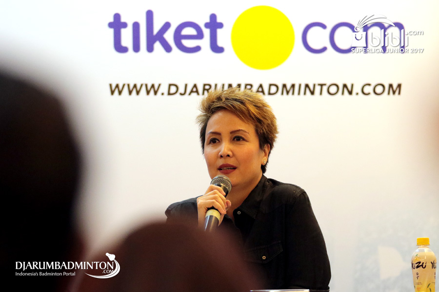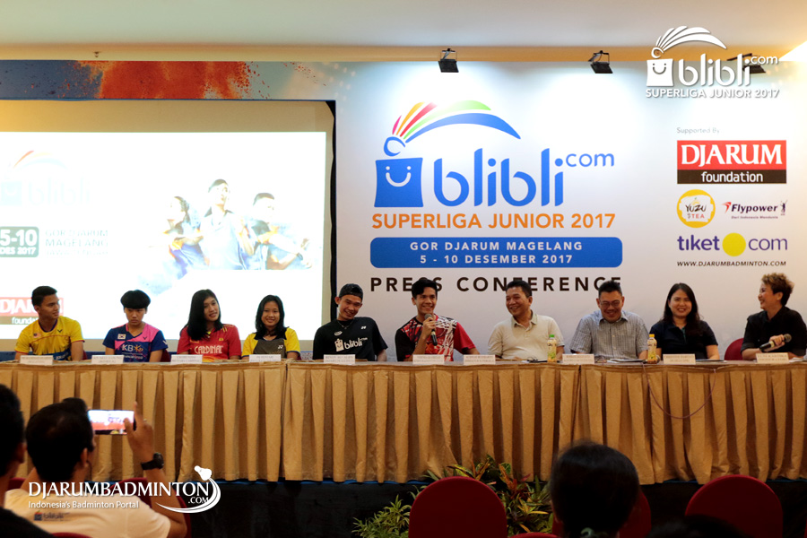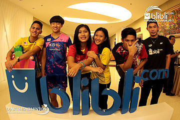Dari Kiri Ke Kanan: Muhammad Syahmi (Malaysia), An Seo Young (Korea), Choirunnisa (PB Mutiara Cardinal), P.H Mentari (PB Jaya Raya), Yeremia Erich (PB Bxist) Dan Rinov Rivaldy (PB Djarum) Berpose Ala Korea Usai Press Conference Blibli.com Superliga Junior
