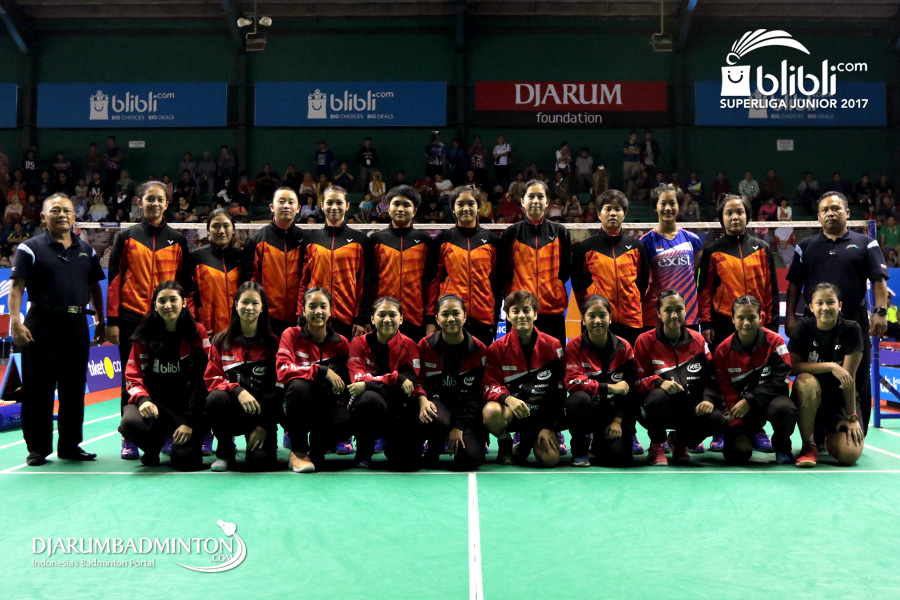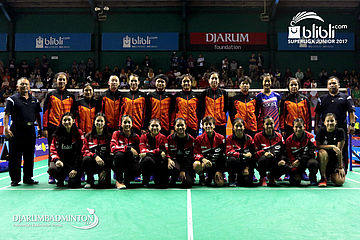 Tim U-17 Putri Exist (Belakang) Berfoto Bersama Tim U-17 Putri Djarum (Depan) Sebelum Memulai Laga Final Blibli.Com Superliga Junior 2017