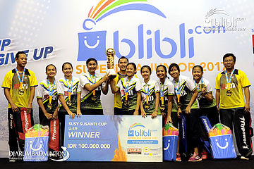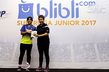 Susy Susanti (Kanan) Menyerahkan Trofi Blibli.com Superliga Junior 2017 'Susy Susanti' Kepada Jaya Raya Jakarta