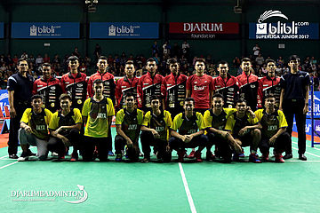 Tim Putra U-19 Djarum (Belakang) Berfoto Bersama Tim Putri U-19 Jaya Raya Jakarta (Depan) Sebelum Memulai Partai Final
