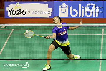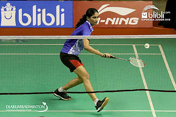 Amolika Singh (INDIA) bersiap menyambut shuttlecock