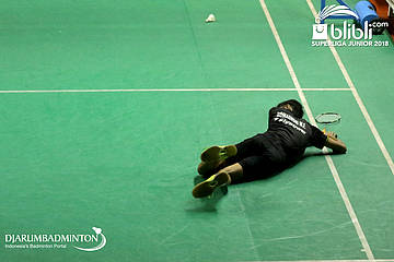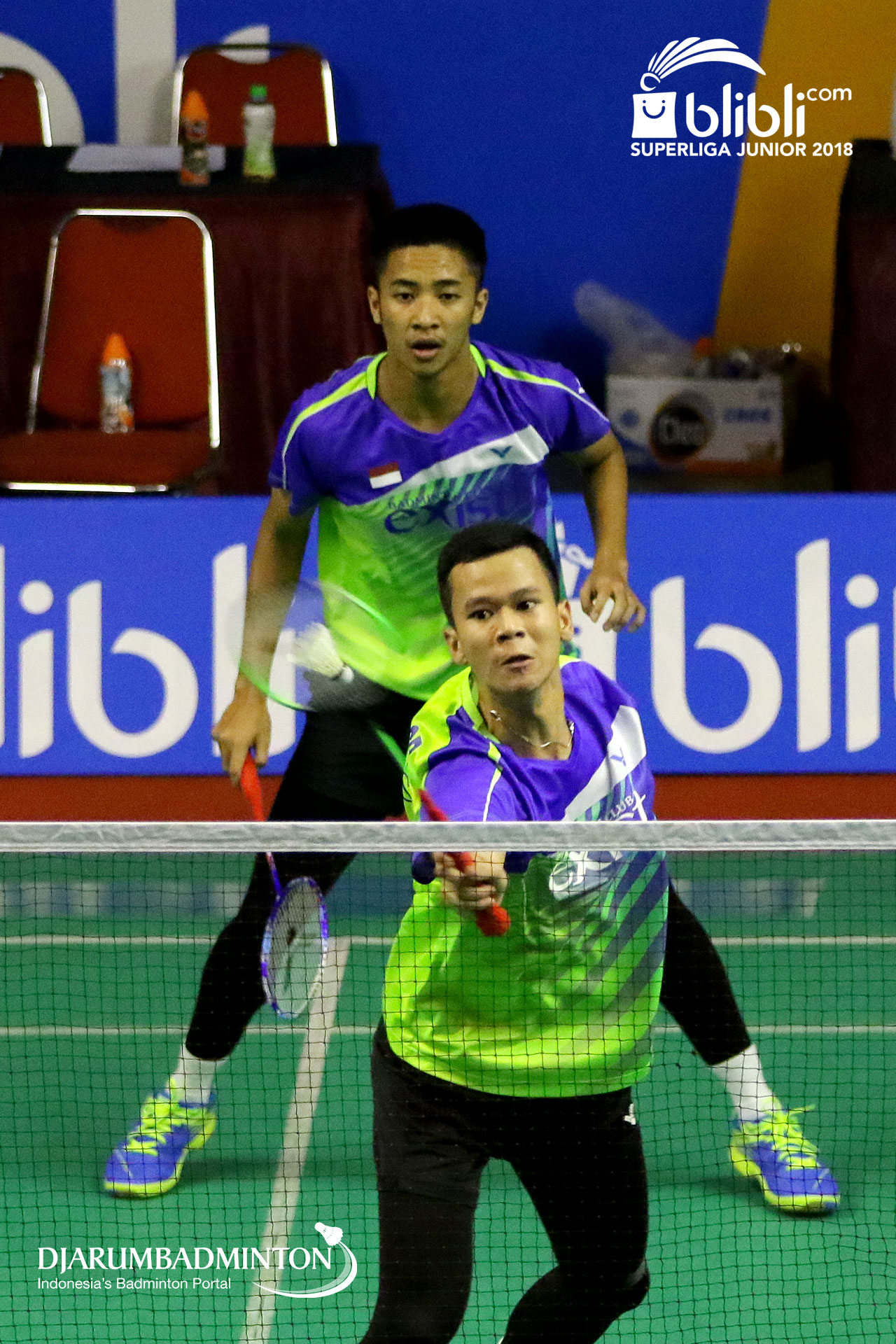 Caesar Bagus Sadewo/Dejan Ferdinansyah (PB. EXIST) menyambar pengembalian