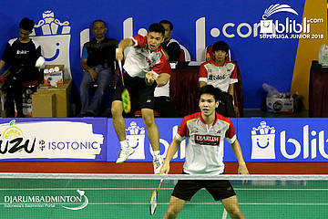 Jian,You-Cheng/Su,Chun-Chi (KEELUNG HIGH SCHOOL-CHINESE TAIPEI) melepaskan serangan