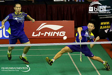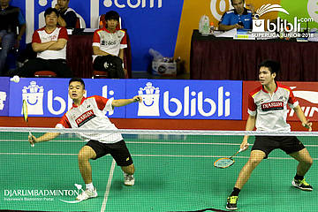 Daniel Marthin/Leo Rollycarnando (PB. DJARUM) berusaha mengembalikan shuttlecock