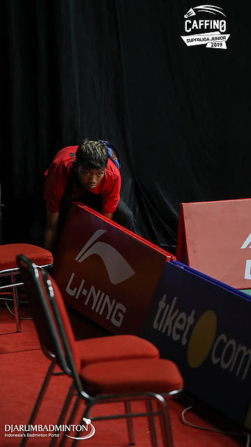 Seorang pekerja mempersiapkan logistik Caffino Superliga Junior 2019