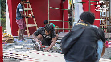 Beberapa orang pekerja mempersiapkan logistik Caffino Superliga Junior 2019