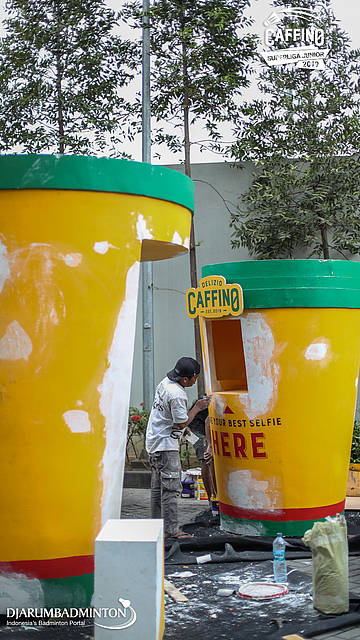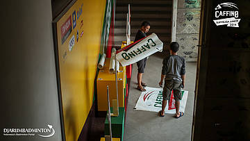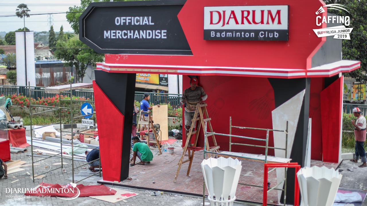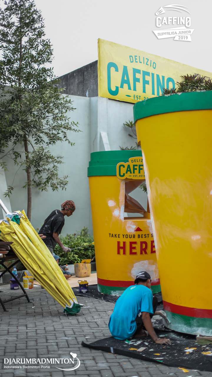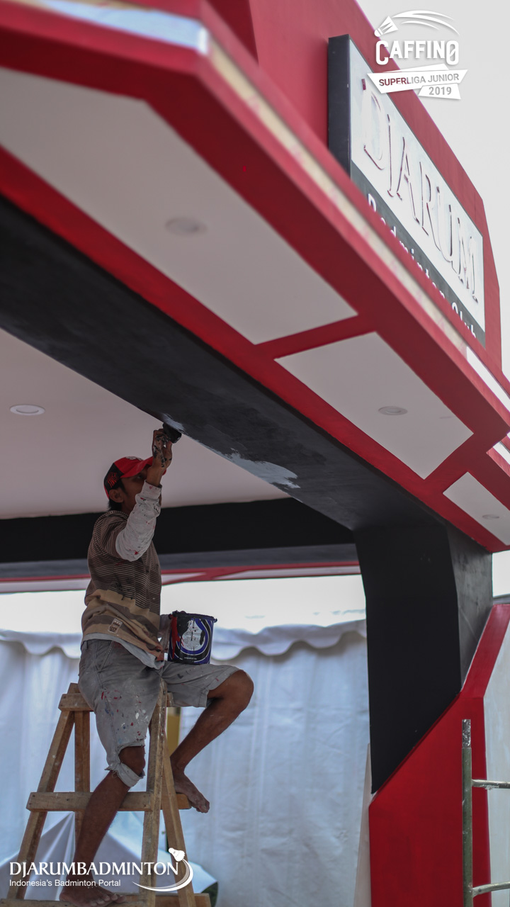 Dua orang pekerja mempersiapkan logistik Caffino Superliga Junior 2019