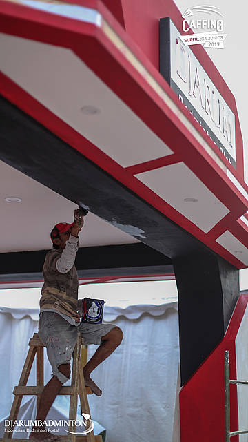 Seorang pekerja mempersiapkan logistik Caffino Superliga Junior 2019