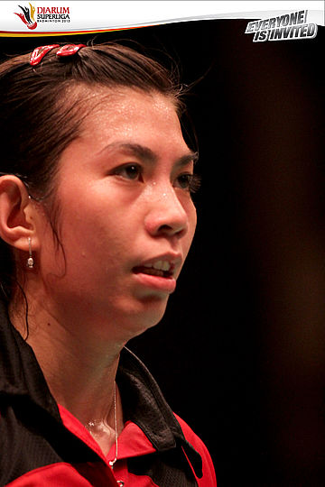 Ekspresi Ayumi Mine (Renesas Badminton Club Jepang) saat berhasil mencuri poin dari Tai Tzu Ying (PB Djarum)