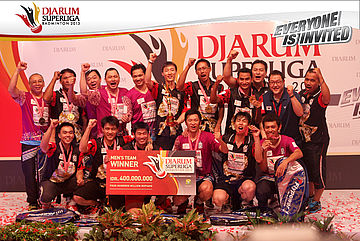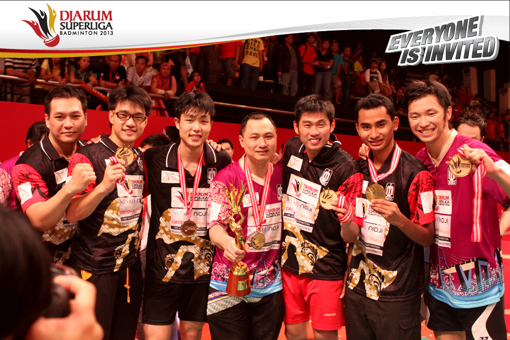 Selebrasi PB Musica Champion setelah berhasil memastikan diri menjadi juara di Djarum SUperliga Badminton 2013