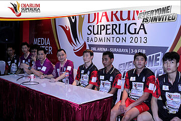 Direktur Djarum Superliga Badminton 2013 Yoppy Rosimin (kiri) didampingi Broto (kanan) saat melakukan press conference
