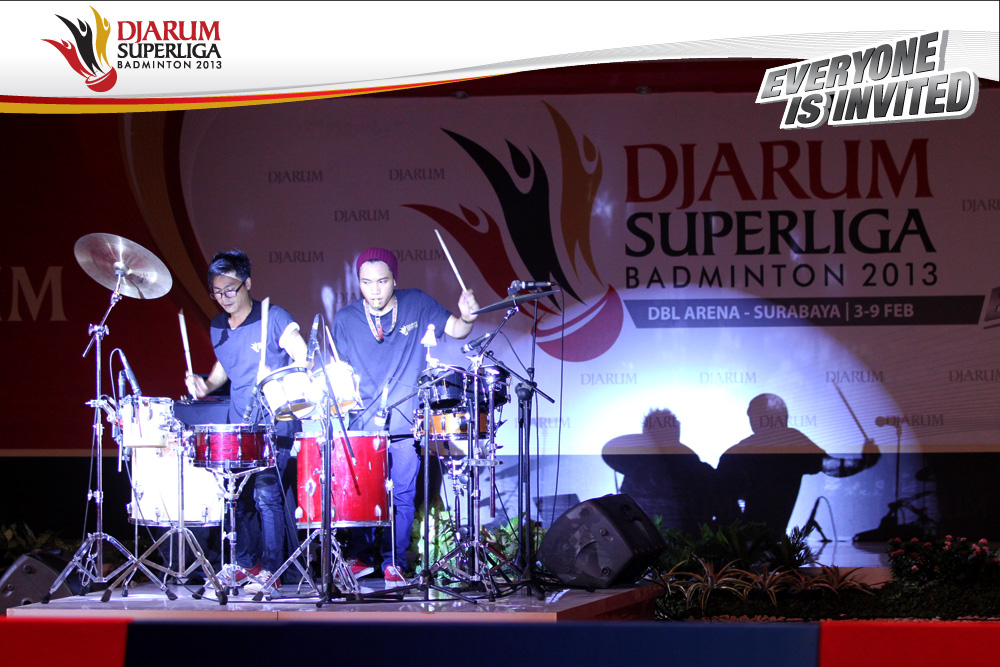 Aksi penampilan perkusi sebelum laga final cukup membuat seluruh penonton Djarum Superliga Badminton 2013 di DBL Arena terhibur