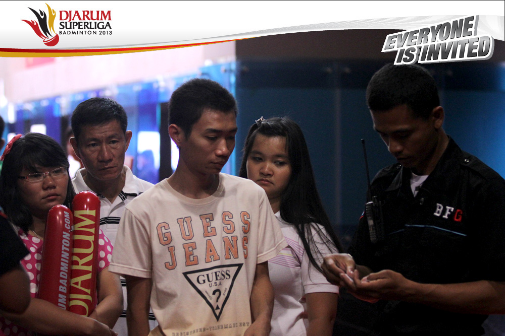 Seorang petugas sedang memeriksa tiket penonton yang akan menyaksikan Final Djarum Superliga Badminton 2013 di DBL Arena Surabaya