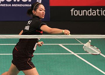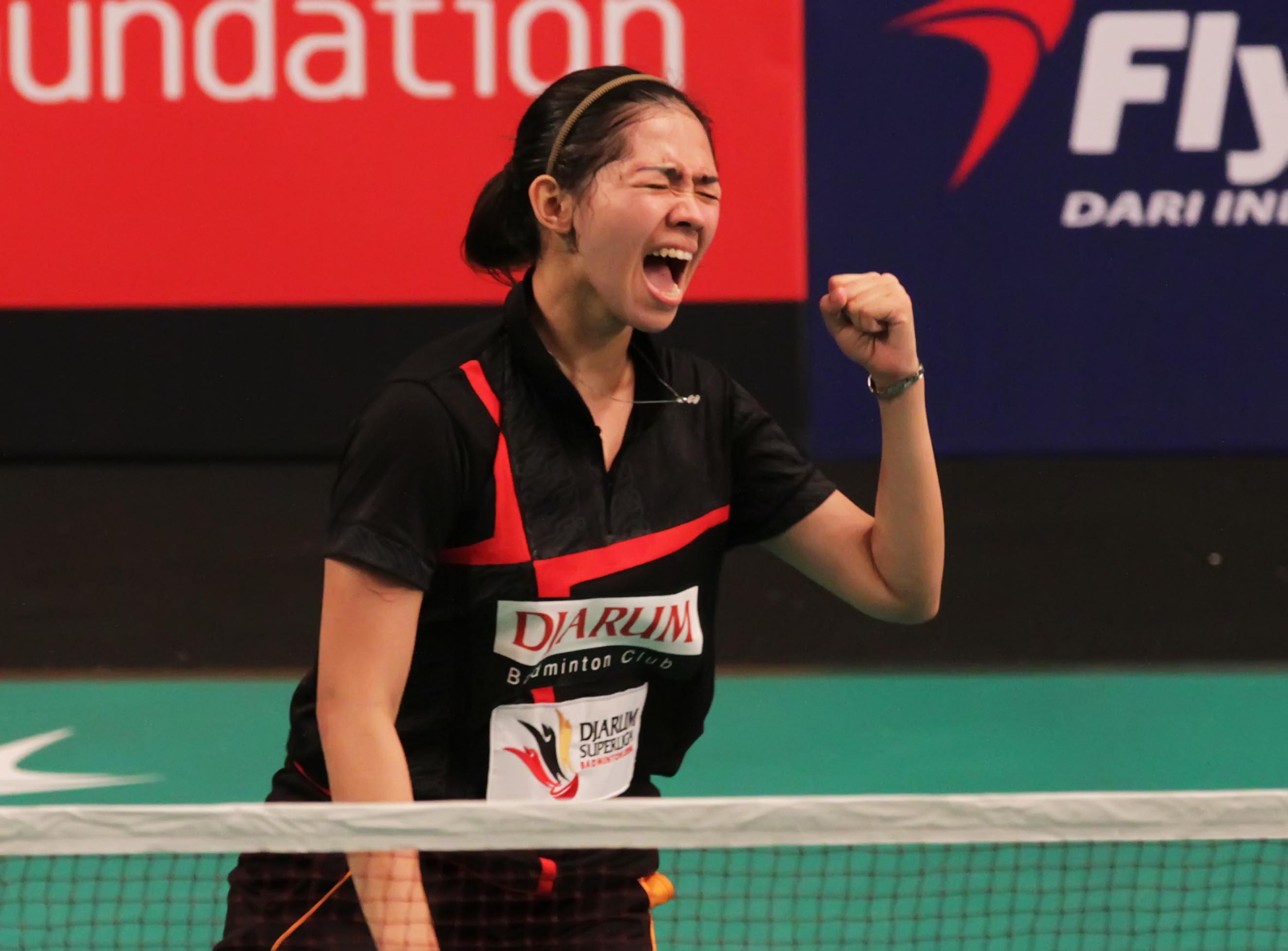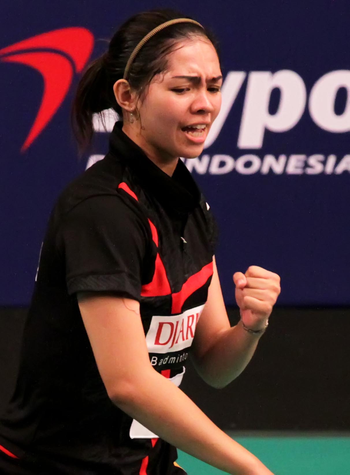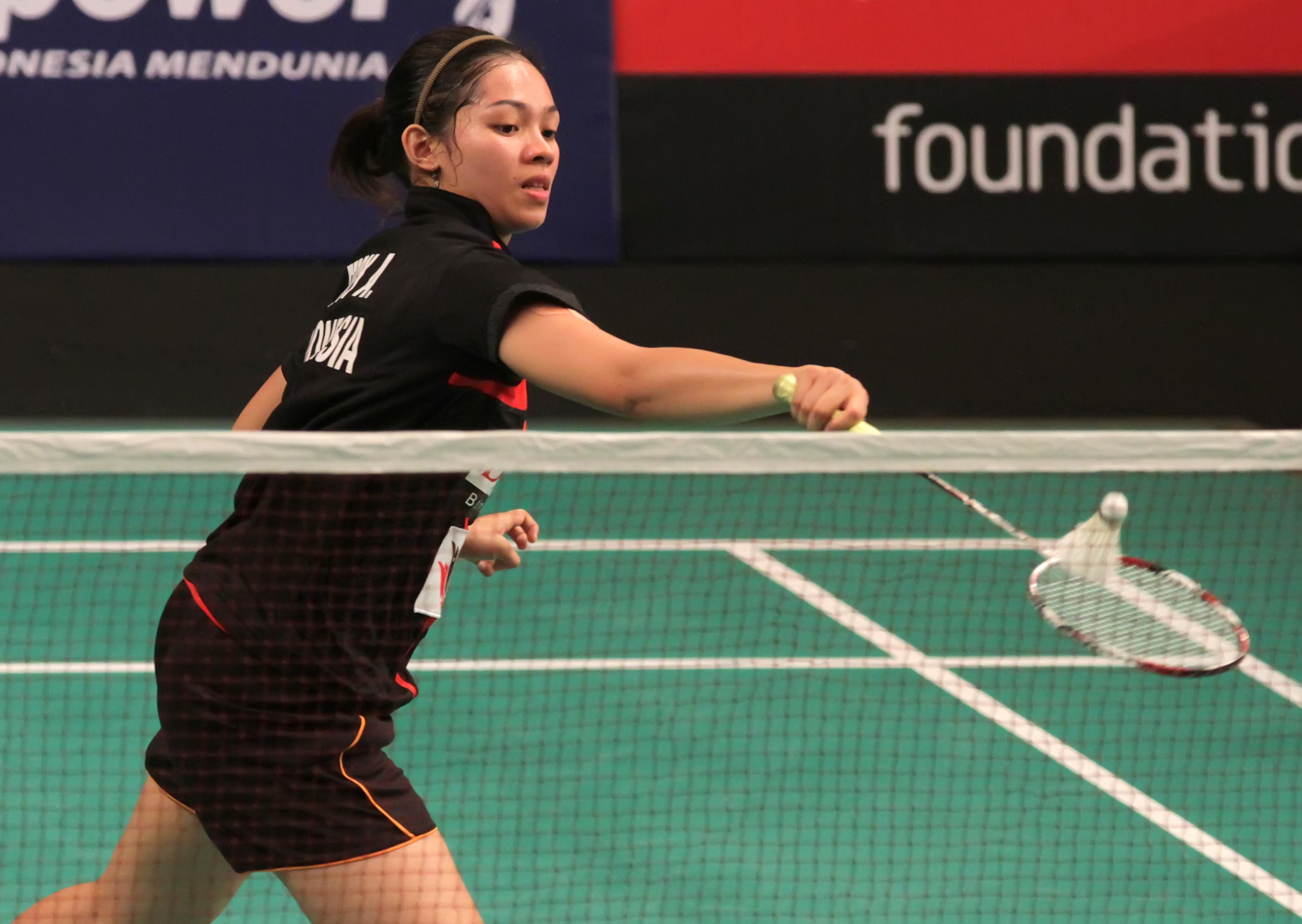Ekspresi Febby Angguni saat menghalau shuttlecock