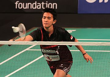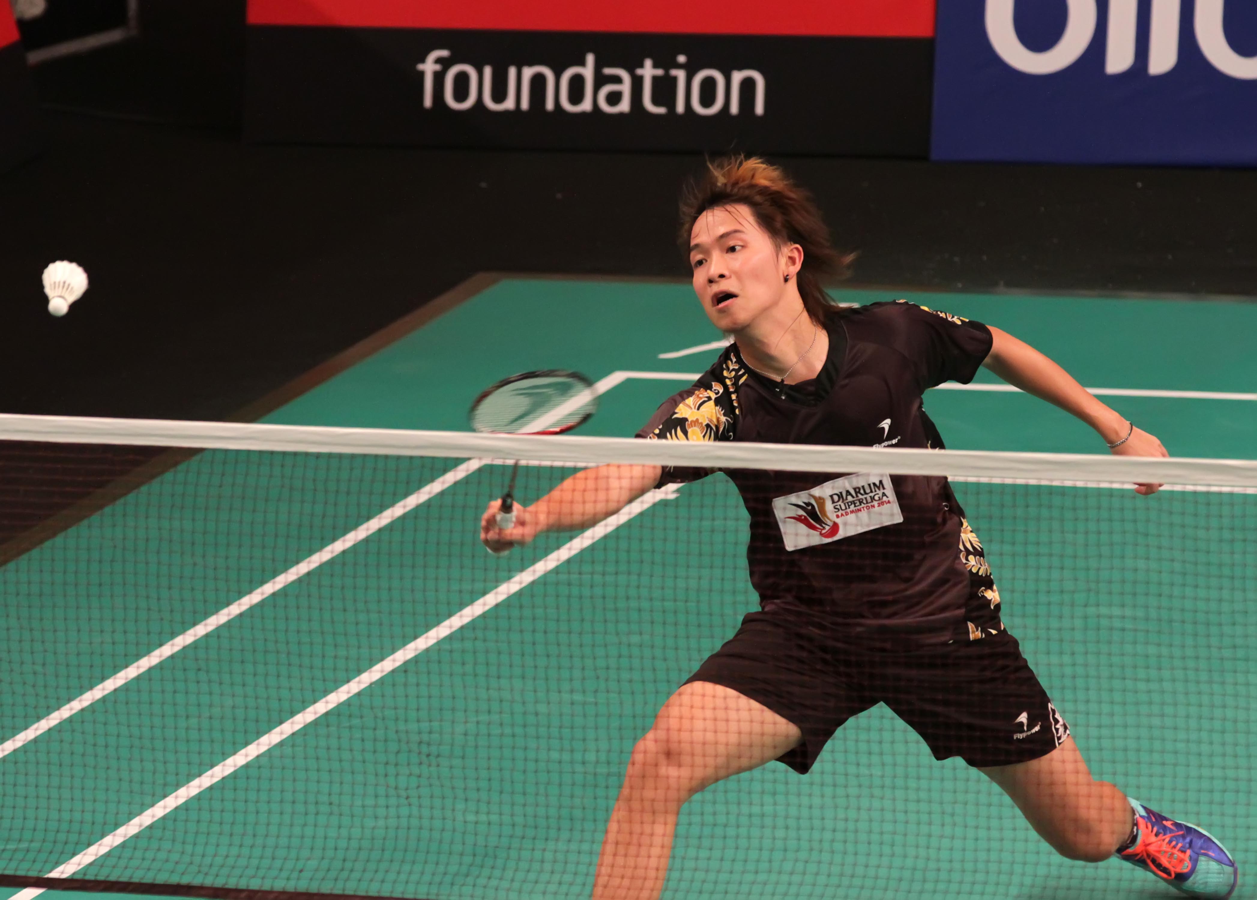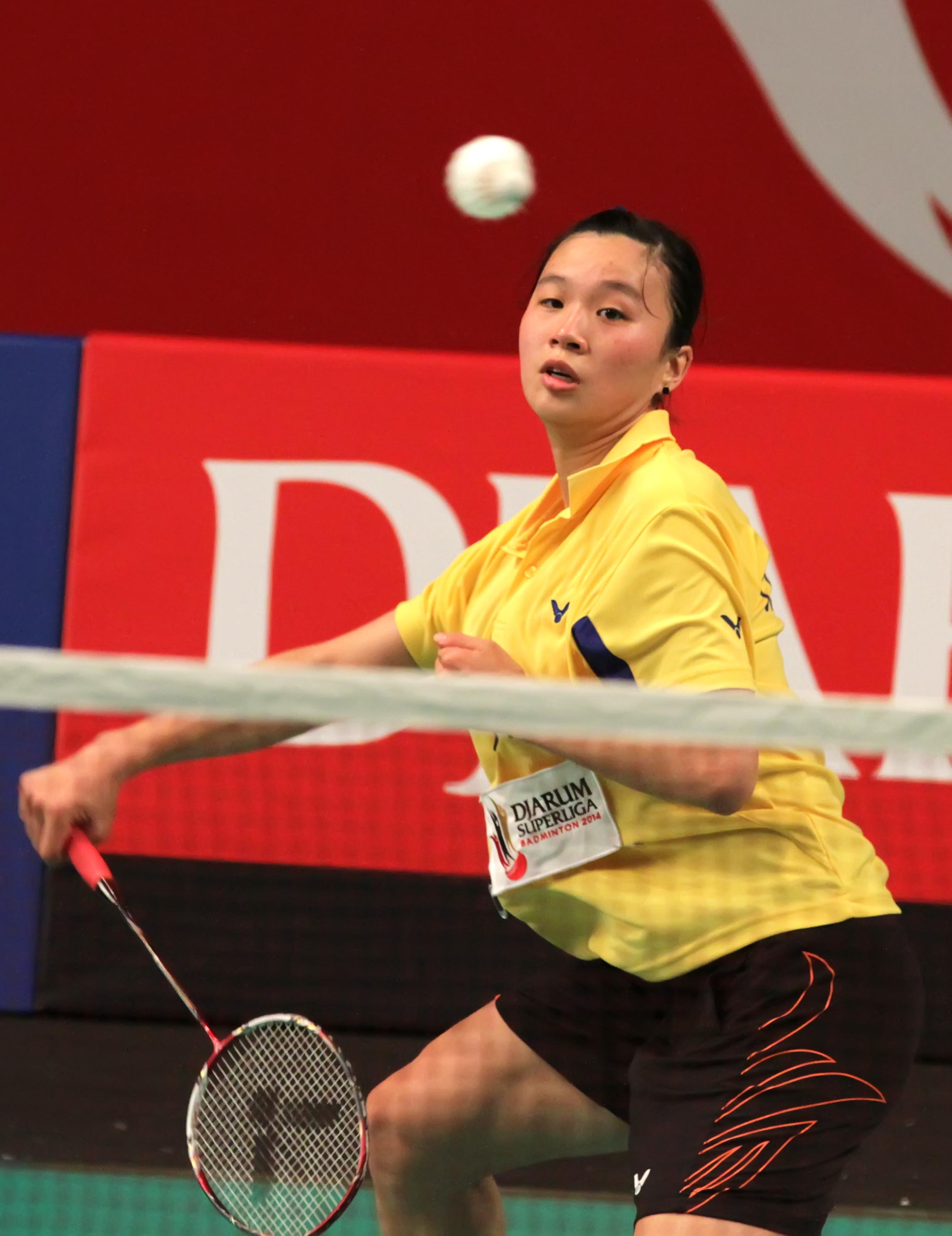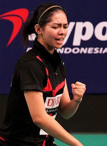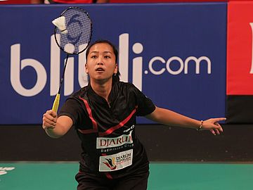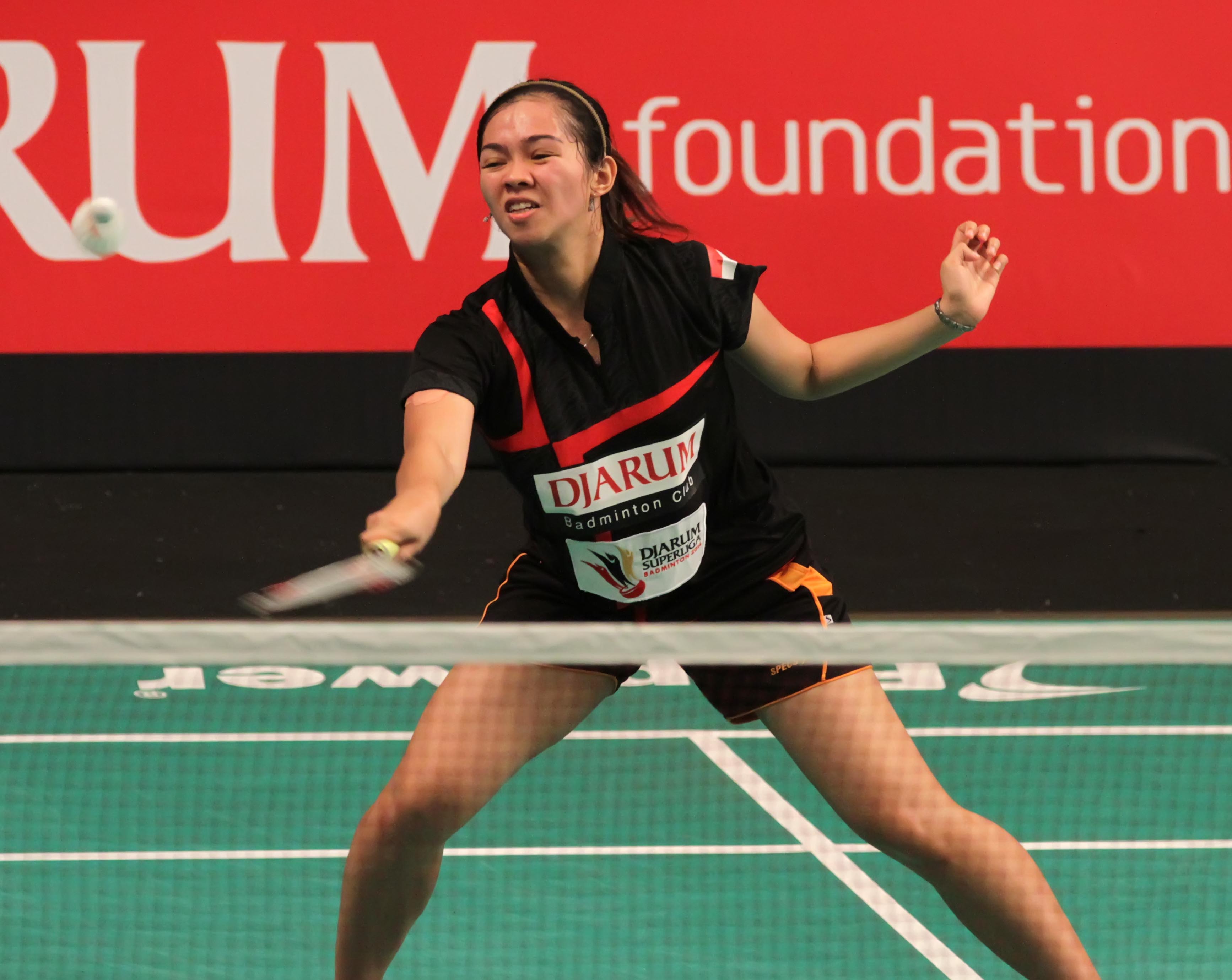 Ekspresi Febby Angguni saat menghalau shuttlecock