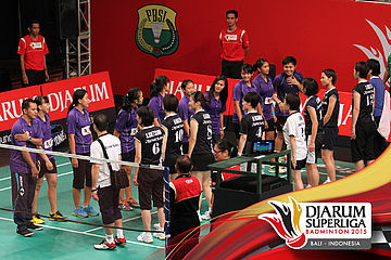 Miyuki Maeda/Reika Kakiiwa (Renesas Jepang) memberikan isyarat saat berhadapan dengan Apriyani Rahayu/Jauza Fadhila (Jaya Raya New Star).