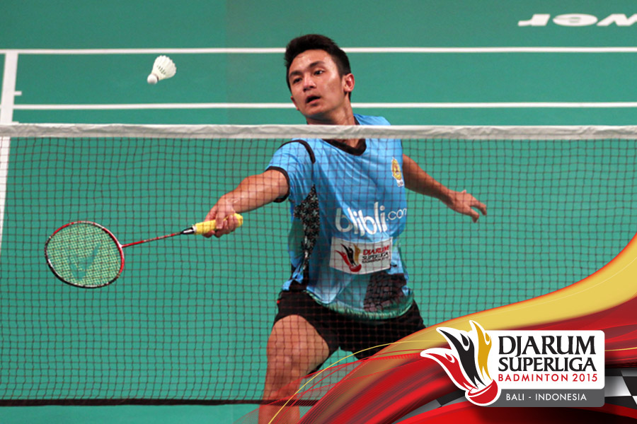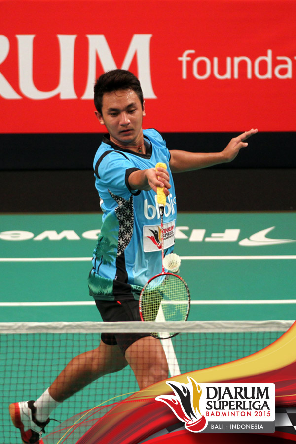 Thomi Azizan (USM Blibli) mengembalikan shuttlecock ke arah Sho Sasaki (Tonami Jepang).