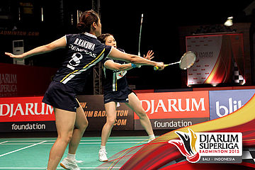 Miyuki Maeda/Reika Kakiiwa (Renesas Jepang) mengembalikan shuttlecock ke arah Pia Zebadiah/Rizki Amelia (Jaya Raya).