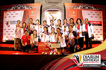 Juara putri Djarum Superliga 2015, Jaya Raya berpose bersama.