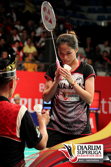 Ratchanok Intanon (Jaya Raya) memberikan salam saat memiminta pergantian shuttlecock.