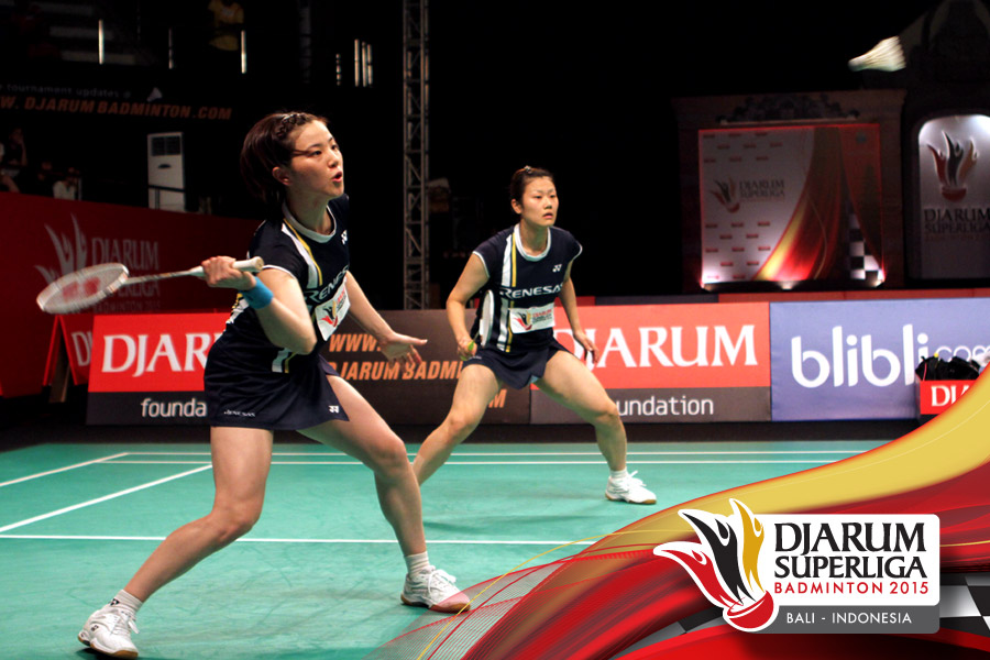 Miyuki Maeda/Reika Kakiiwa (Renesas Jepang) menghadang serangan yang dilepaskan Pia Zebadiah/Rizki Amelia (Jaya Raya).