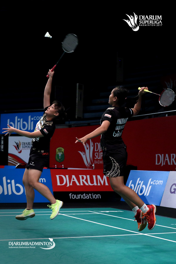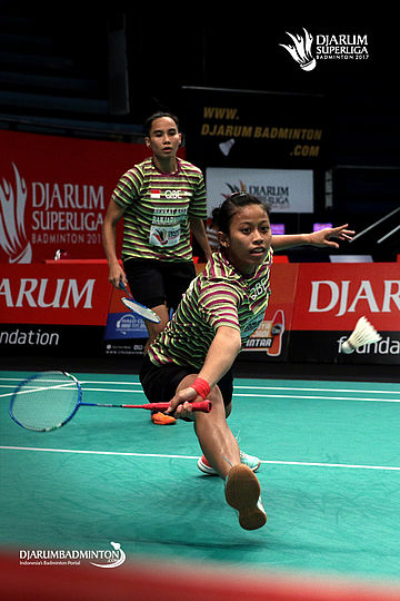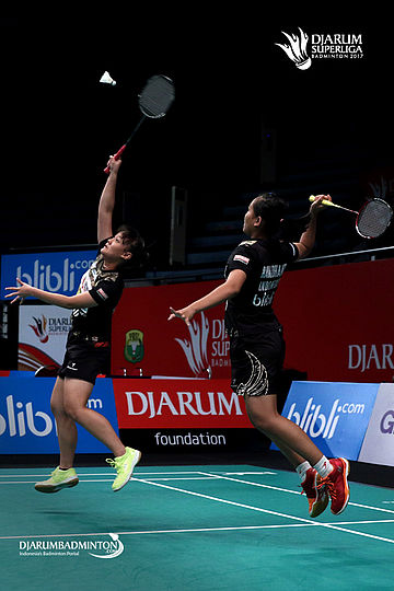 Devi Tika Permatasari/Keshya Nurvita Hanadia (PB Berkat Abadi) mengembalikan shuttlecock.