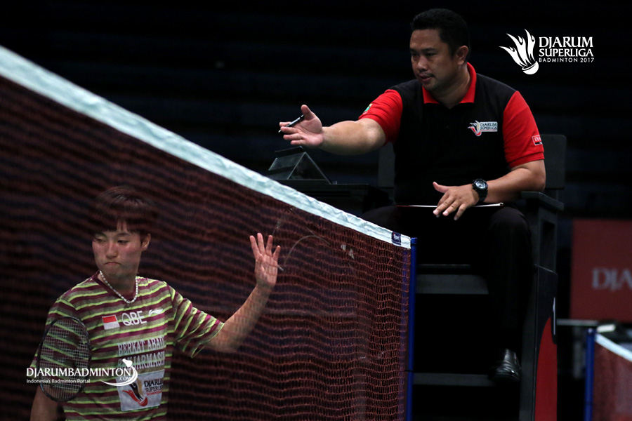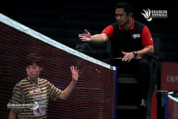 Yip Pui Yin (PB Berkat Abadi) meminta maaf kepada Umpire setelah melakukan protes.