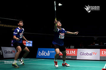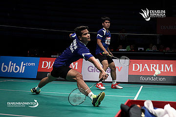 Hardianto/Ricky Karanda Suwardi (PB Mutiara Cardinal) mengembalikan shuttlecock.